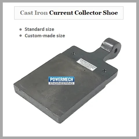 Cast Iron Current Collector range varies from 150Amps to 1200Amps. Current Collector Shoe is supplied in Cast iron, Cast Steel, Brass, Bronze or Phosphor Bronze to suit for Steel Industry, Foundry and Other Heavy Industry.