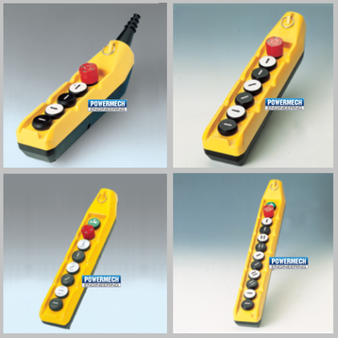- Number of buttons ranging from 5 push buttons (4 plus 1) up to 14 push buttons (12 plus 2) for Crane, hoist application, lifting platform, tails lift application and auxiliaries circuits